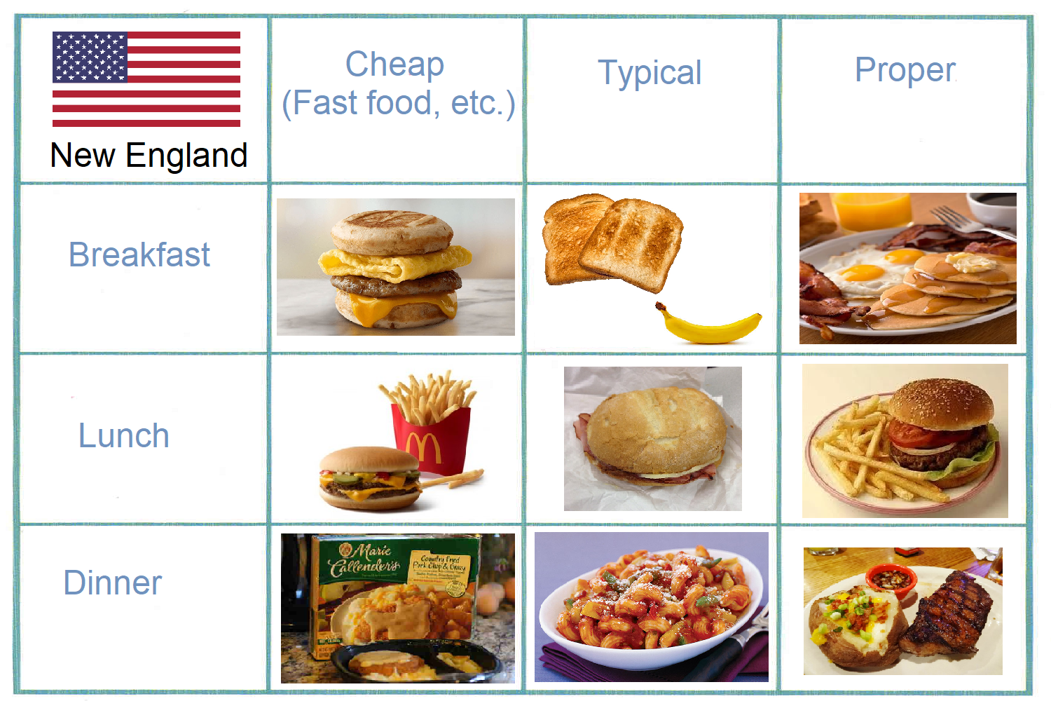 ※縦軸は朝食・昼食・夕食、横軸は安い(ファストフード)、普通、きちんとした食事