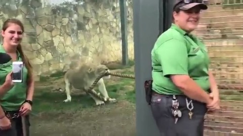 雌ライオンはびくともせず。WWEレスラーは綱を全く引くことができず、雌ライオンは口で綱をずっと引っ張っている。WWEレスラーが