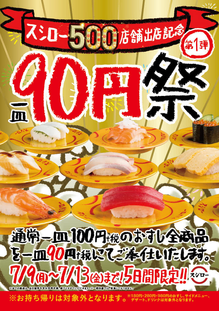 「90円祭」は、「スシロー須賀川店」(7月12日出店)のオープンにより国内出店500店舗を達成することを記念して実施されるもの。