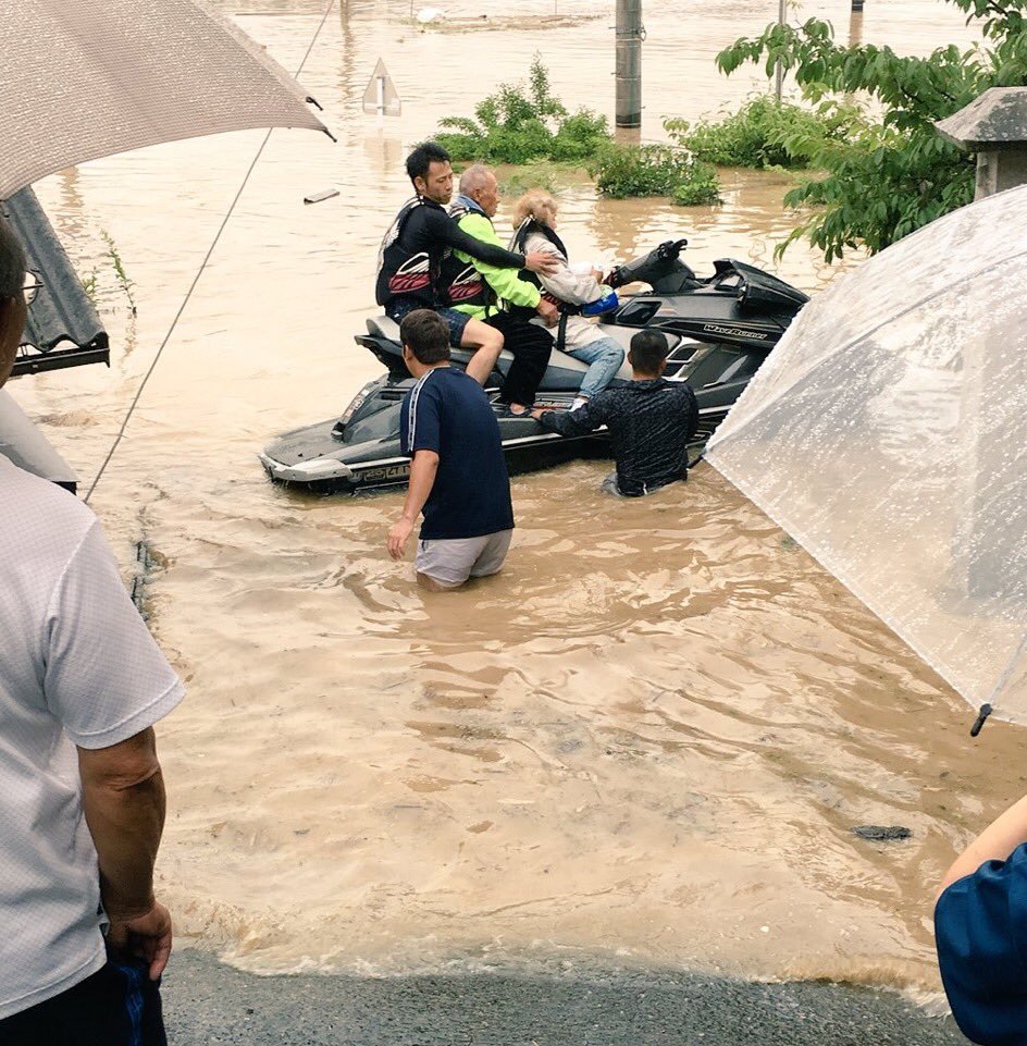 西日本を襲った大雨はあまりにも量が多く、ついには家の1階部分を覆い尽くした。2階や屋根の上に避難した人たちはひたすら助けを待つ。そんな中で活躍したのは水上バイクの一般人。かっこよすぎる。