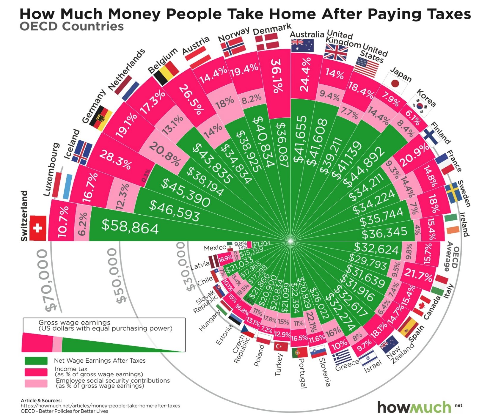 OECD各国の平均年収から所得税(ピンク)と社会保険料(薄いピンク)を差し引いた手取りを比較した画像が海外で話題を集めていたので反応をまとめました。賃金で13位の日本は手取り換算だと41,139ドル(約453万)となり8位に上昇しています。