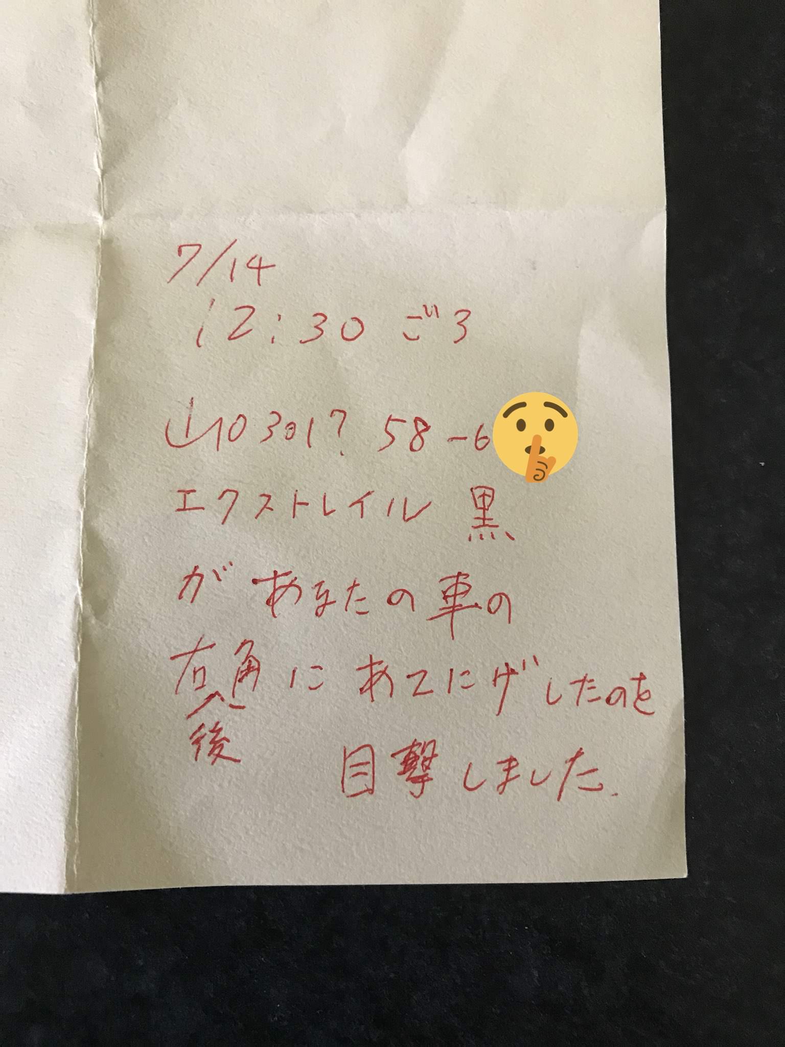 今日昼過ぎ、マックの駐車場で当て逃げされた。何も気付かず車に乗ろうとしたら、ドアノブにメモが挟んであって、それで事故とわかった。