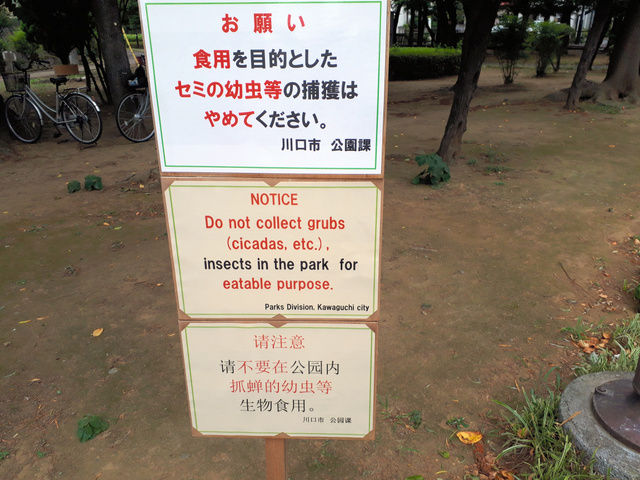 食用を目的としたセミの幼虫などの捕獲はやめてください――。埼玉県川口市の青木町公園総合運動場にこんな文言の看板が設置され、ツイッターで話題になっている。市によると、複数の市民からセミの幼虫を大量に捕っているという苦情を受け、6月に設置したものだ。