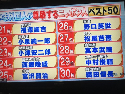 ホーム > ニュースetc > 外国人が尊敬する日本人ランキングとかいうやつwwwwwwwwwwwwww 2018/09/03 http://rabitsokuhou.2chblog.jp/images/img/img/adJS/rabitop.js 1:風吹けば名無し:2018/09/02(日) 01:15:28.99 ID:MMxvIOz40.net 最近のテレビってこんなんばっかよな 続きを読む Source: ラビット速報 - ニュースetc