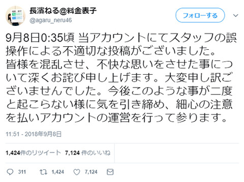 「9月8日0:35頃 当アカウントにてスタッフの誤操作による不適切な投稿がございました。