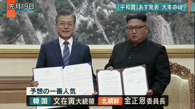 ノーベル平和賞を巡っては候補者が韓国文在寅大統領と北朝鮮の金正恩が受賞するのではとタイム誌や韓国メディアが報じていたが、ワシントンポストが「金正恩にノーベル平和賞を受賞させるべきでない」という指摘もあった。