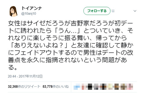 トイアンナさん「男性はデートの改善点を永久に指摘されない」ツイートが波紋を広げる
