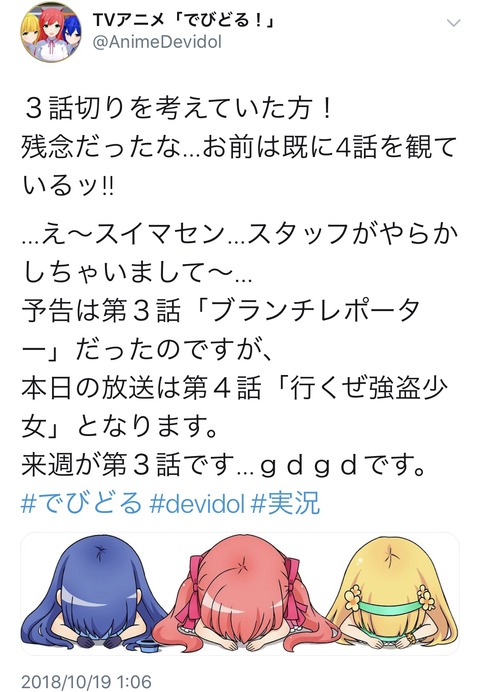 【放送事故】アニメ「でびどる!」が3話と間違えて4話を放送してしまうwwwwwwwwwwww