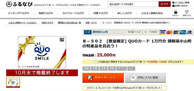 静岡県小山町は、特定のふるさと納税サイトに時間限定で、寄付額の4割にあたるクオカードやアマゾンギフト券などを掲載。主に土日に表示され、「10月末で終了」としていた。その神出鬼没ぶりから、ツイッターなどでは「闇ふるさと納税」「総務省の目を逃れるためでは?」といった書き込みが相次いだ。佐賀県みやき町も同様の返礼品を週末に掲載していた。