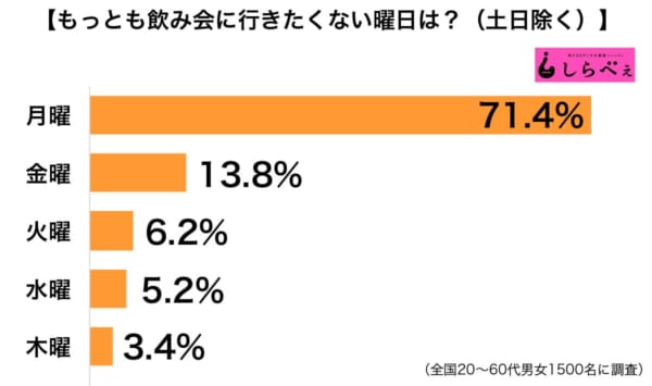 そこで、しらべぇ編集部は、全国20〜60代男女1,500名を対象に、「土日を除き、もっとも飲みに行きたくない曜日」について調査。以下、ランキング形式で発表しよう。