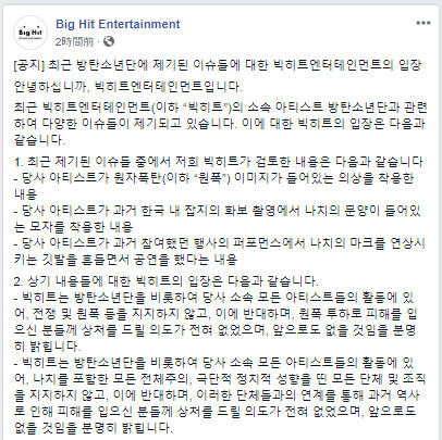 事務所のビッグヒットエンターテインメント公式Facebookを通じて次のように謝罪。「ビッグヒットは、戦争や原爆を支持しておらず、これらに反対する。原爆投下で被災された方々を傷付ける意図が全くありませんでした」