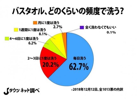 大っぴらに人には聞きづらいこの問題について、Jタウンネットでは2018年11月19日から12月12日まで、「バスタオル、どれくらいの頻度で洗う?」という質問で、読者アンケートを行ってきた(総得票数:1013票)