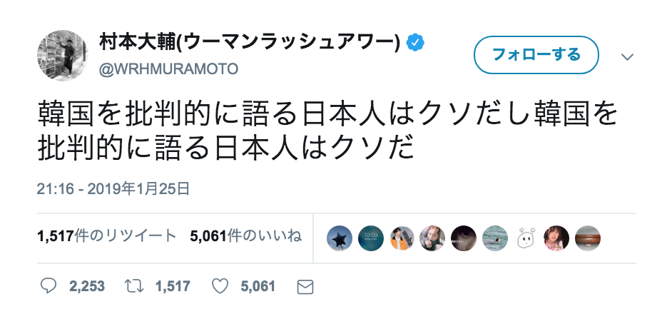 ウーマン村本「韓国を批判的に語る日本人はクソだし韓国を批判的に語る日本人はクソだ」