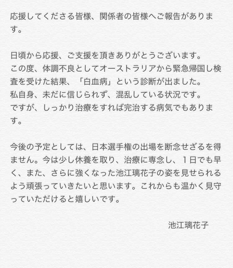 【速報】水泳池江璃花子ちゃん、白血病