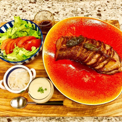 トロみのついたタレの光沢に食欲をそそられる。グリーンサラダとトマトで彩りと栄養もプラスされ、体にも優しい夕食だ。■丹精込めて手作りした「焼き豚」