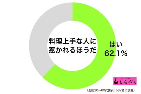しらべぇ編集部が全国の20~60代の男女1,537名を対象に「料理上手な人」に対する意識調査を実施したところ、全体で6割以上の人が