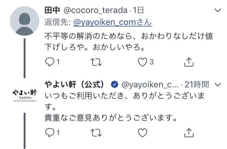 ホーム > ニュースetc > 【悲報】やよい軒の公式Twitterアカウント、おかわり反対派に冷たい 2019/04/19 1: 風吹けば名無し 2019/04/19(金) 06:47:19.07 ID:z+C4SSv30 一般的なリプ おかわり反対派へのリプ ええんかお前ら これ不平等だよね 続きを読む Source: お料理速報 - ニュースetc