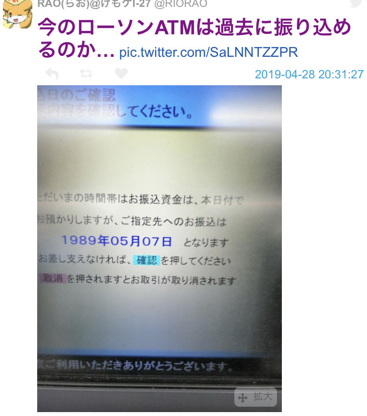 【悲報】ローソンATMが平成元年に戻るバグ発動。大型連休、改元の混乱スタート