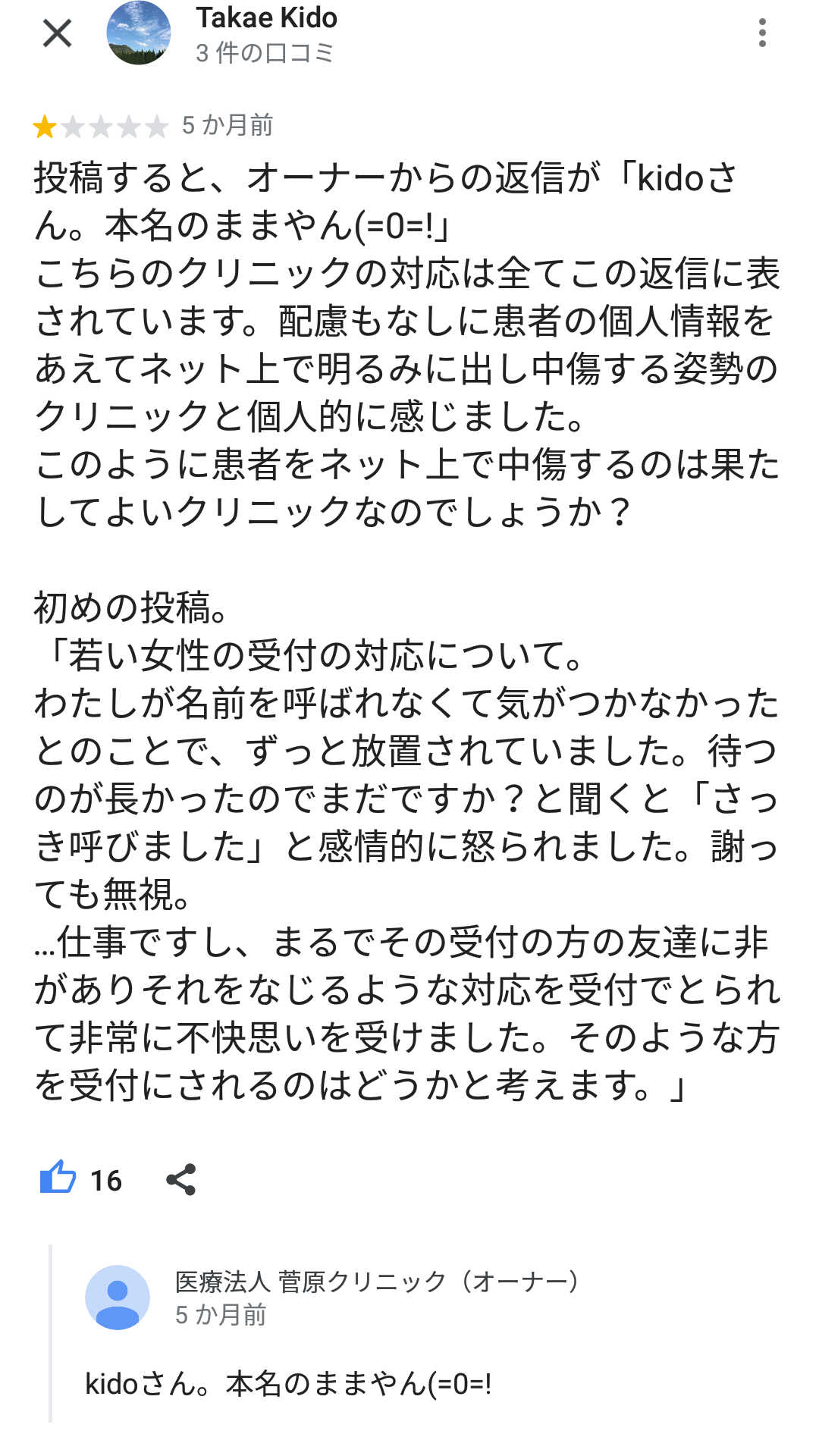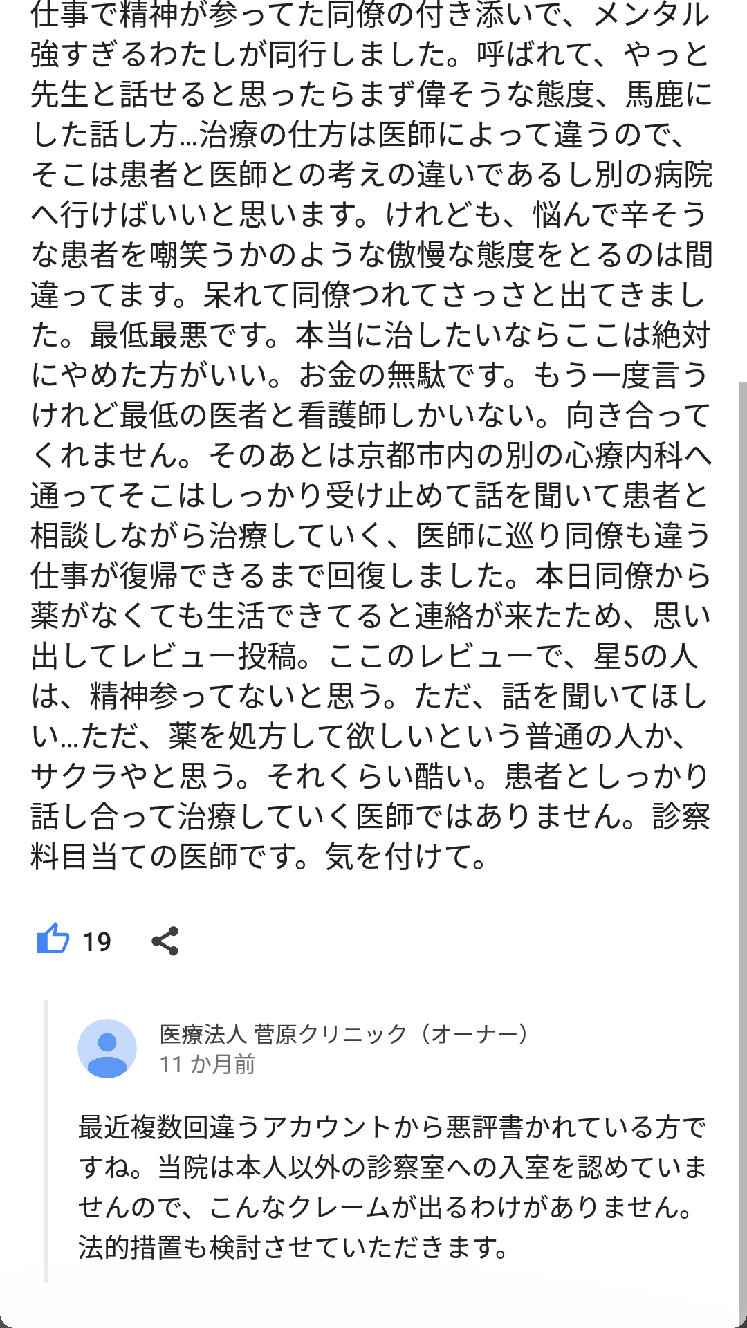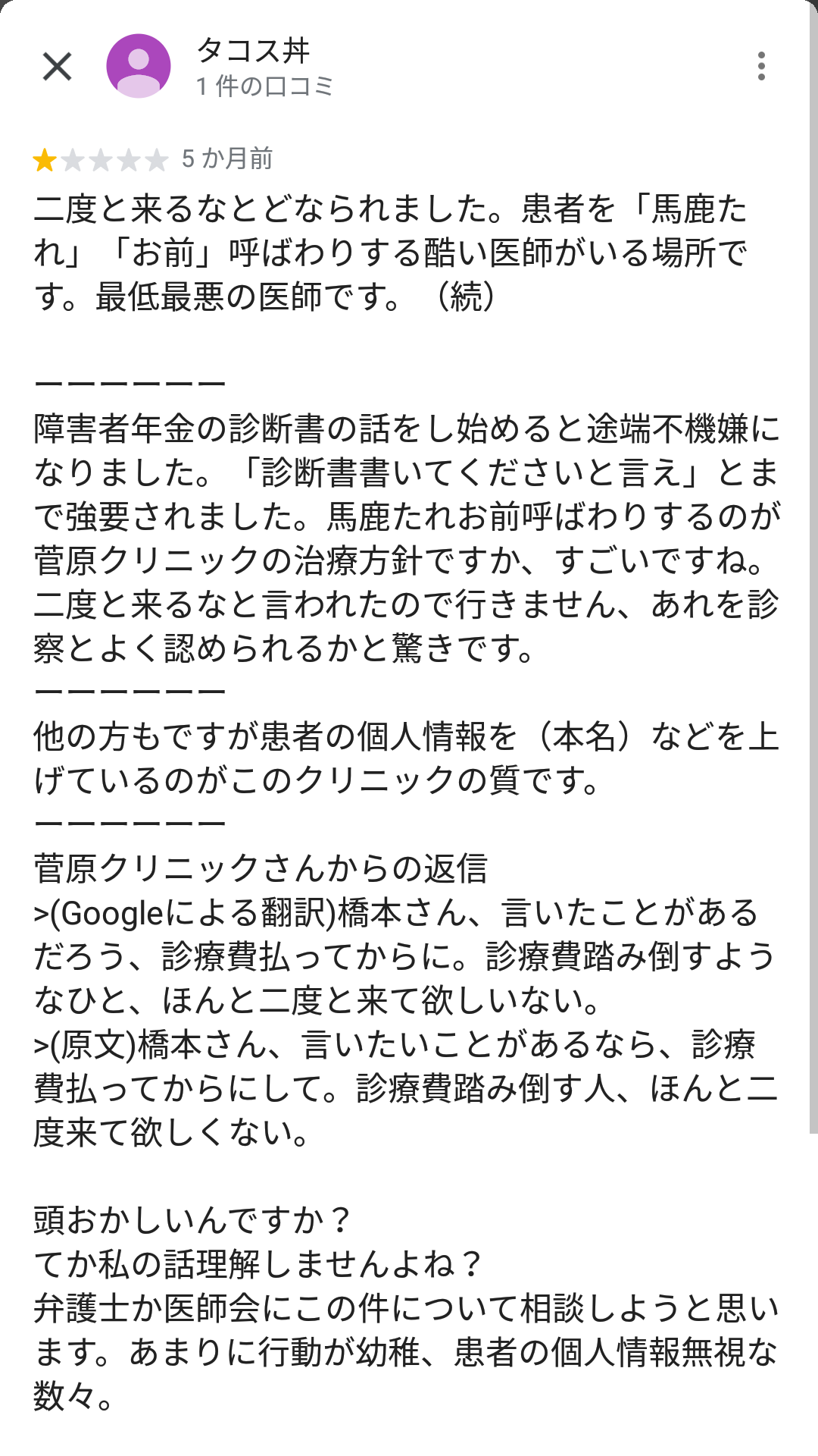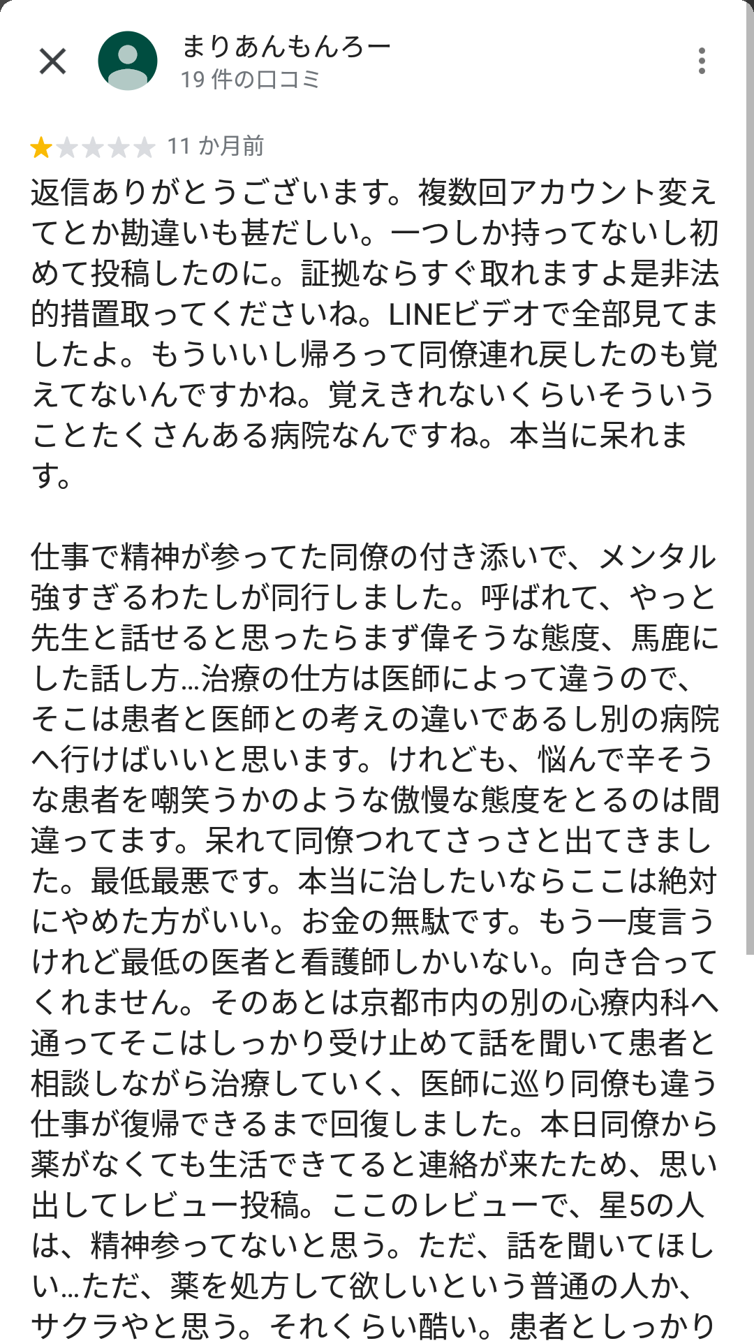 ホーム > ニュースetc > 【悲報】精神病院さん、うっかり低評価レビューにブチ切れしてしまう 2019/05/11 1: 風吹けば名無し 2019/05/11(土) 08:55:47.14 ID:4ftXCgQqM.net やべーなこの病院 続きを読む Source: 妹はVIPPER - ニュースetc