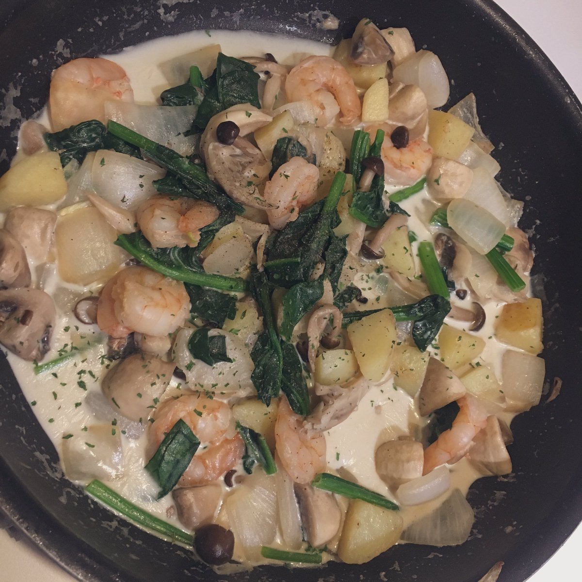エビ、きのこ類、ほうれん草、、好きなものたくさんで作りました??