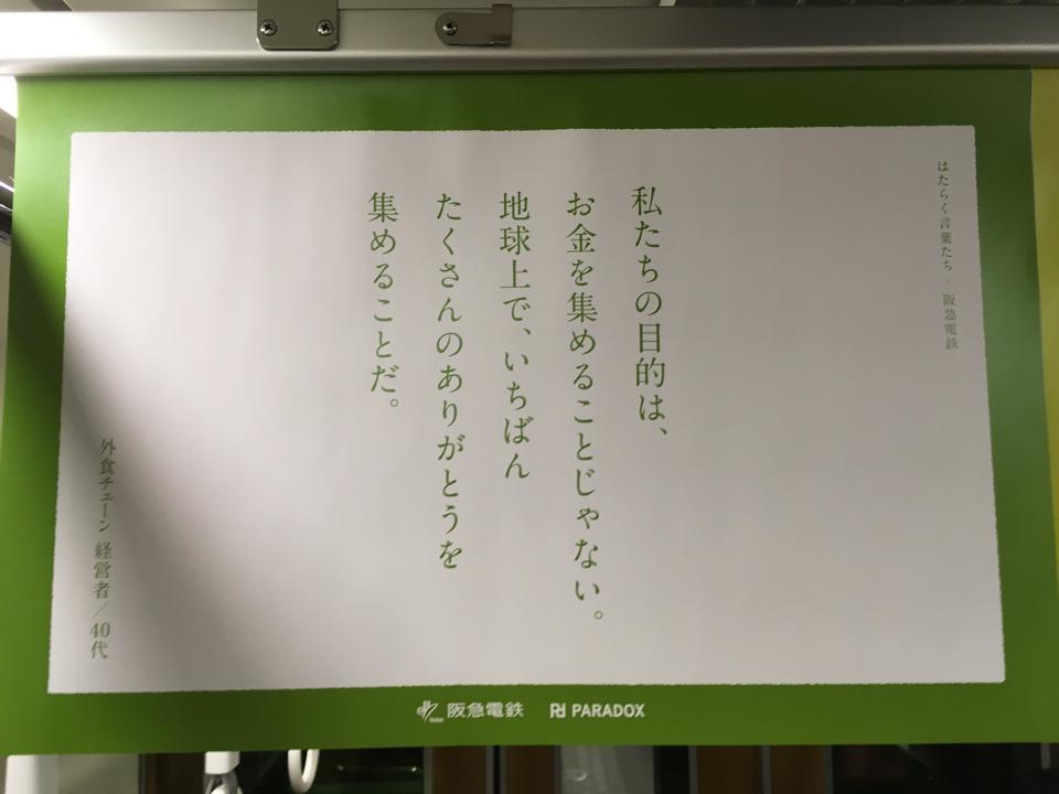 この言葉を、もっと多くの人に届けることで、働くことにやりがいや誇りを見出だすきっかけにならないだろうか──と、こうした“言葉”をまとめて発信しているのだそうです。阪急の車内に掲示したのは「選りすぐった熱い志を