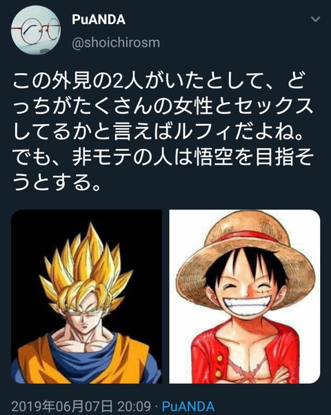 【悲報】女の子「ルフィの方が絶対モテるのに、ネットのキモオタ達はなぜ悟空を目指すのだろう?」