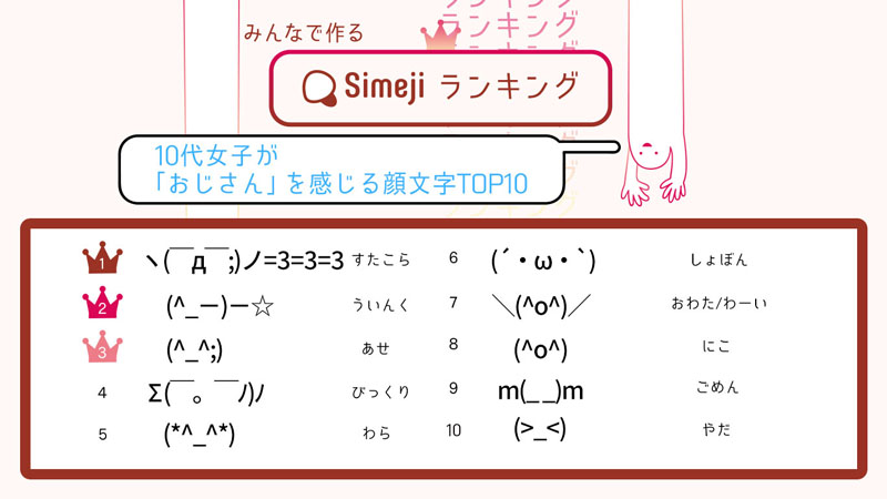 スマートフォン用キーボードアプリ「Simeji」を手掛けるバイドゥが、「10代女子が『おじさん』を感じる顔文字」なる恐ろしいランキングを発表。 慌てて走る様子を示す「ヽ( ̄д ̄;)ノ=3=3=3」がトップに立ちました。変換時の読み「すたこら」自体が……ねえ……。