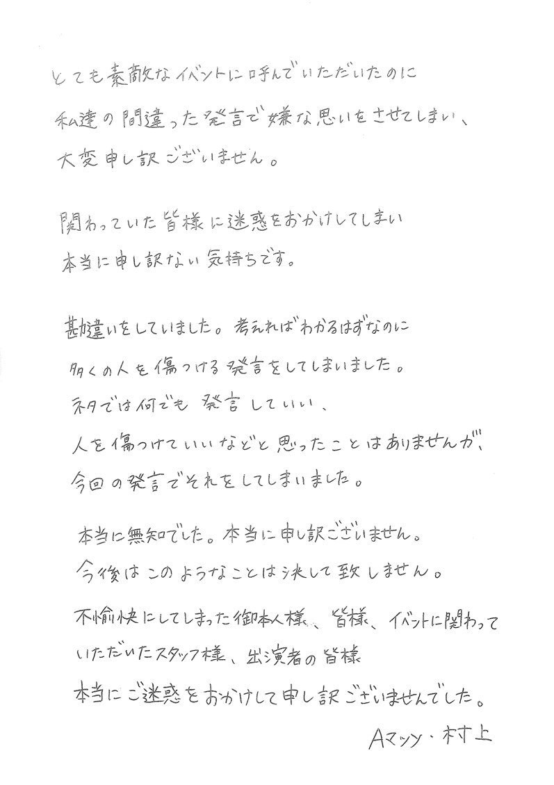 Aマッソの所属するワタナベエンターテイメントは9月24日夜に謝罪文を発表したが、いずれも、大坂選手の名前や発言内容は伏せられていた。