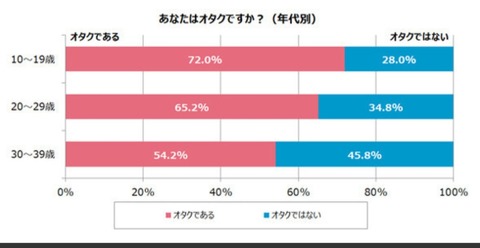 今回の調査でも「あなたはオタクですか?」という質問に対し、10代では72%、20代は65%、30代は54%と、全ての世代で過半数の人が自分は「オタク」であると回答しています。自分が「オタク」をしているジャンルを聞いてみると、「アニメ」「漫画」「ゲーム」などのジャンルを挙げた人は、全ての世代で20%前後と高い割合になりました。