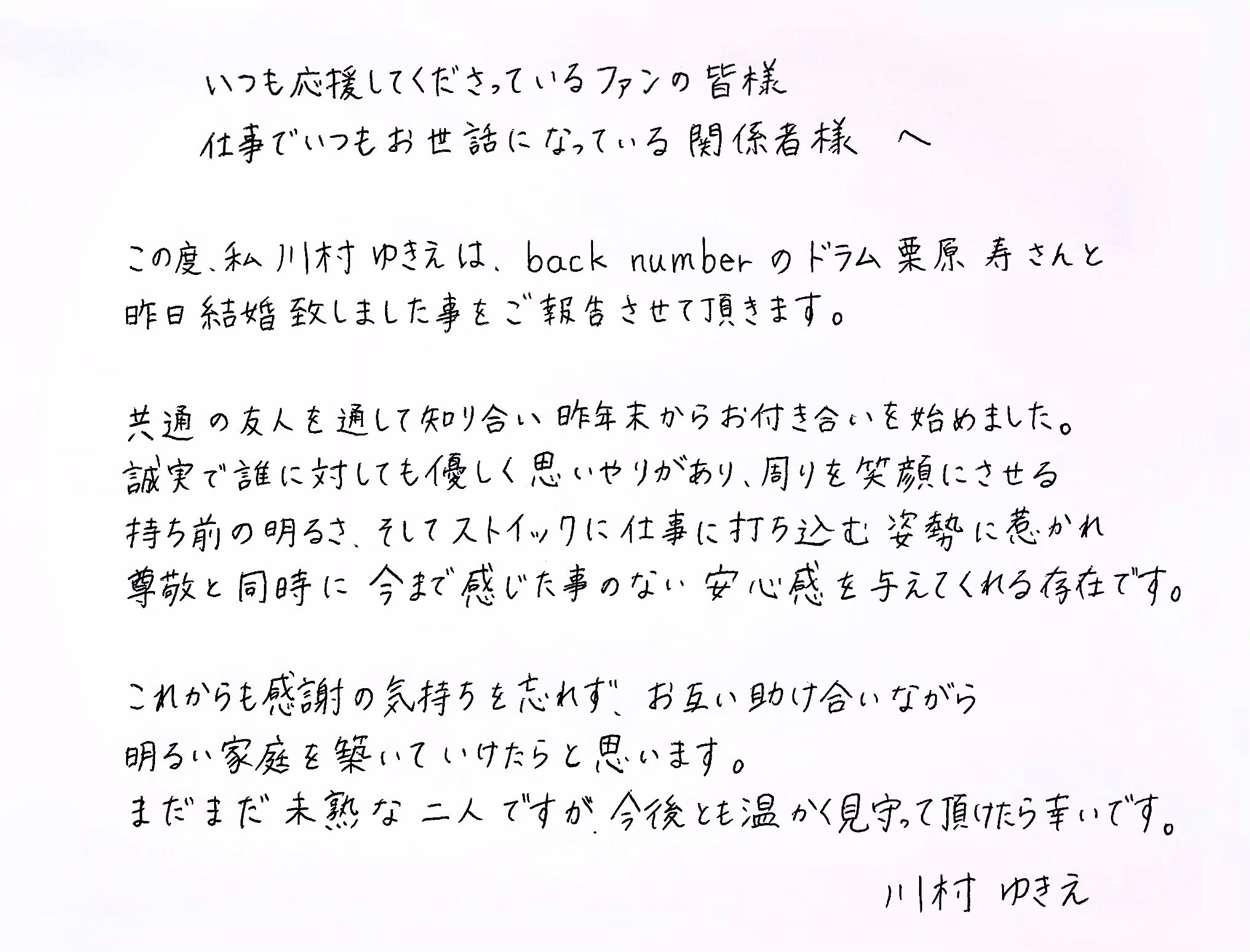 川村ゆきえ(33)結婚 back numberのドラム・栗原寿と