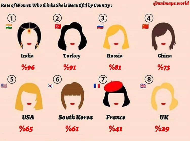 国ごとの自分が美人だと思ってる女性の割合というデータが海外で話題を集めていたので反応をまとめました。インド人女性は96%と美人自負率が高く、逆にイギリス人女性は29%と低くなっています。