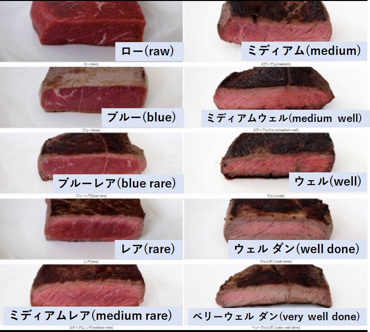 ホーム > ニュースetc > ステーキの焼き方、10種類も存在することが判明 2020/01/17 1: 風吹けば名無し 2020/01/16(木) 09:24:57.29 ID:x18ye+940.net 1.ロー 2.ブルー 3.ブルーレア 4.レア 5.ミディアムレア 6.ミディアム 7.ミディアムウェル 8.ウェル 9.ウェルダン 10.ベリーウェルダン 続きを読む Source: 妹はVIPPER - ニュースetc