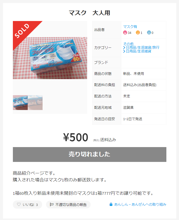ホーム > ニュースetc > 【悲報】マスク転売ヤーさん、姑息な手段に出てしまう 2020/03/02 1: 風吹けば名無し 2020/03/01(日) 12:58:15.16 ID:ZJleqglA0.net もう1000円以上は出品自体を受け付けないので 画像で釣って1枚500円で売りつけてしまう 30秒で売れてしまった模様 https://item.mercari.com/jp/m71163603467/ 続きを読む Source: 妹はVIPPER - ニュースetc