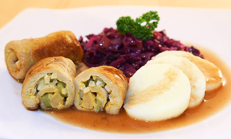 付け合せにはパンの団子と赤キャベツだ