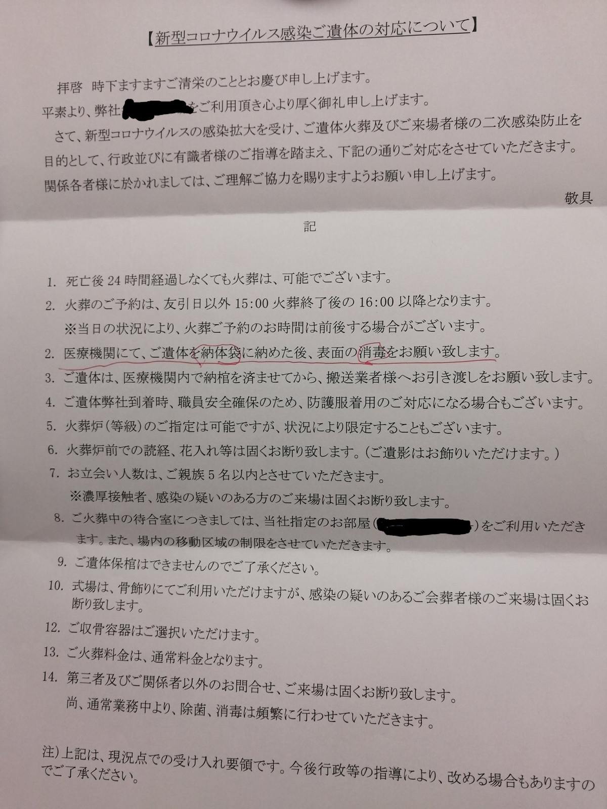 納棺師でもある自分に葬儀社さん経由で通達。新型コロナ感染のご遺体について。