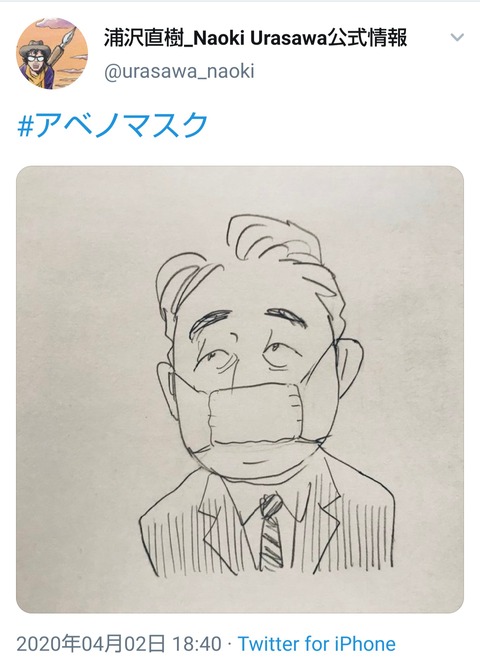 浦沢直樹がアベノマスクの絵を描いて炎上「布マスクでも飛散防止には有効」「国難に協調しない国賊」 (※画像あり)