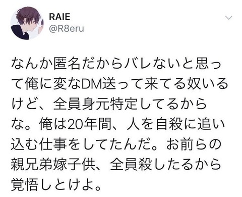 ホーム > ニュースetc > 有名政治ツイ垢「俺は20年間人を自殺に追い込む仕事をしてたんだ。殺してやるから覚悟しておけよ。」 2020/05/13 1:風吹けば名無し:2020/05/13(水) 12:12:03.02 ID:xxeBG/j80.net すごい 2:風吹けば名無し:2020/05/13(水) 12:12:25 かっけえwww 3:風吹けば名無し:2020/05/13(水) 12:12:48 ネトウヨアカウントやんけ 続きを読む Source: ラビット速報 - ニュースetc