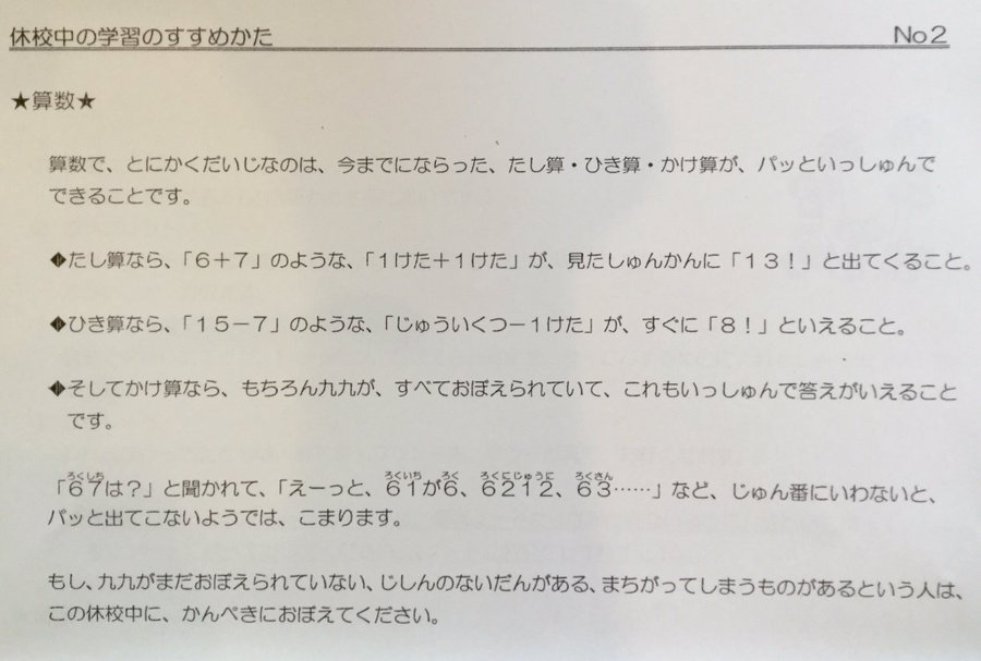 算数なんてこんなプリントだけで新しいこと覚えさせるわけにもいかんし休みのうちに計算能力くらい上げとけよ