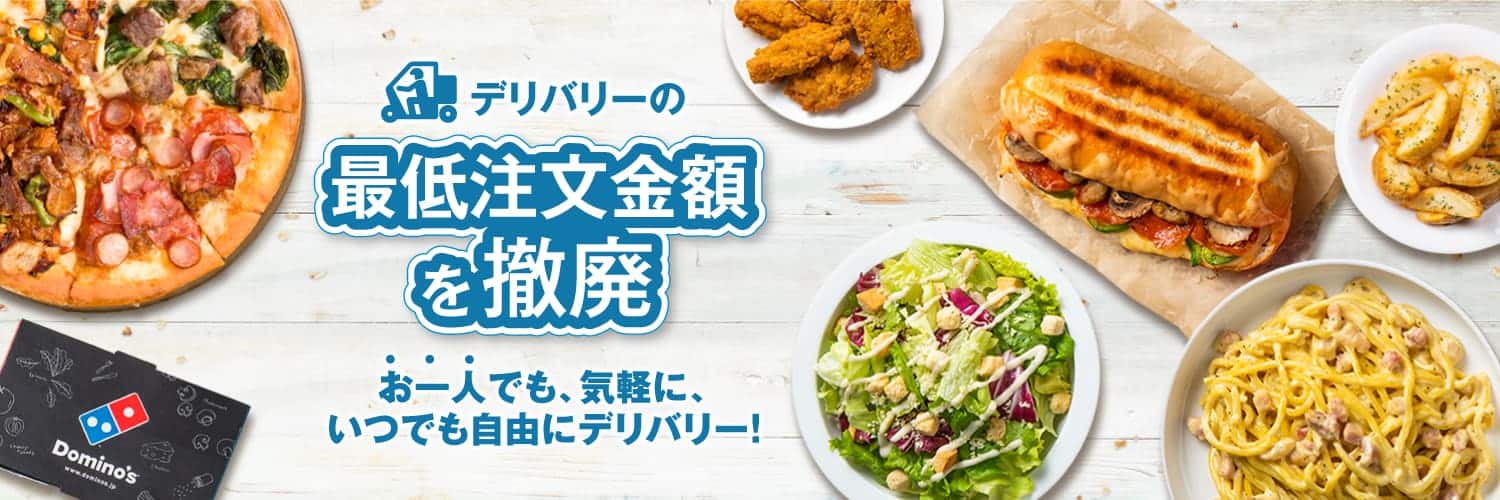 お一人でも、ランチでも、どんな時でも、ドミノ・ピザのデリバリーを手軽にご利用いただくために、デリバリーの最低注文金額を撤廃します。デリバリーの手数料を追加で支払う必要もありません。
