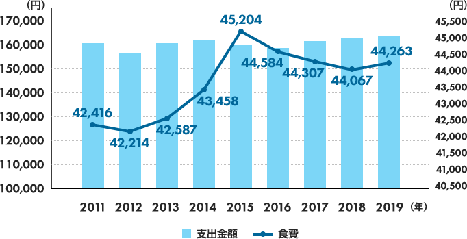 そのうち食費は4万2,000円から4万5,000円の間で推移しています。
