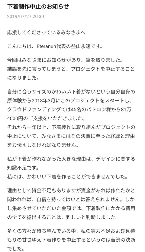 中学生起業家「大きなサイズのブラ作ります!クラファンお願い!」→集まる→「やっぱ諦めます」