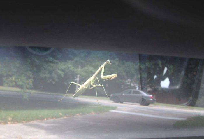 仕事に行く前、フロントガラスで遊んでるカマキリを撮ったらタイミングが悪かった