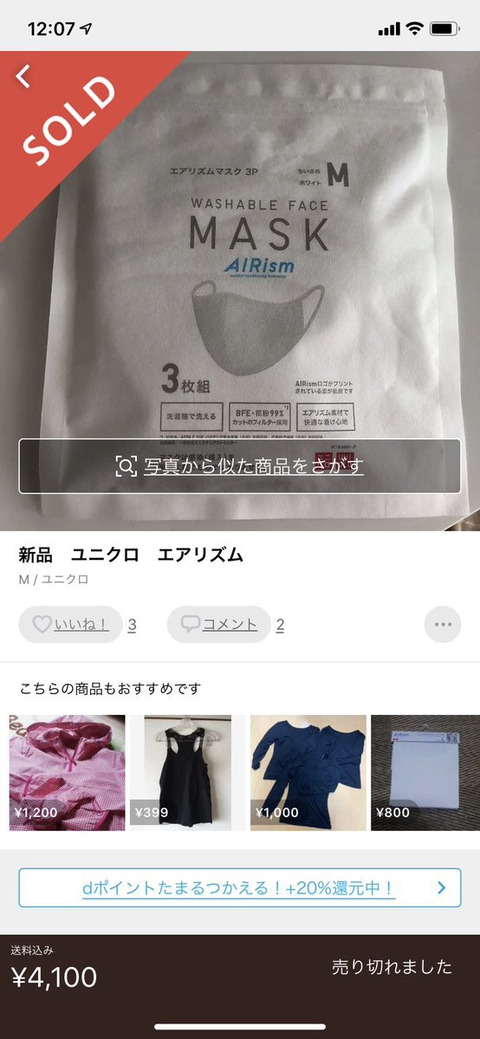 ホーム > ニュースetc > 【画像】ユニクロのマスク、4100円で落札されてしまうwwwwwwwwww 2020/06/19 1:風吹けば名無し:2020/06/19(金) 12:24:16 2:風吹けば名無し:2020/06/19(金) 12:24:48 逮捕怖くないんか 3:風吹けば名無し:2020/06/19(金) 12:24:51 マスクの転売やろこれ 続きを読む Source: ラビット速報 - ニュースetc