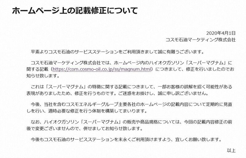 コスモがハイオク虚偽表示 洗浄添加物なし、10年以上サイトに 景品表示法違反恐れ