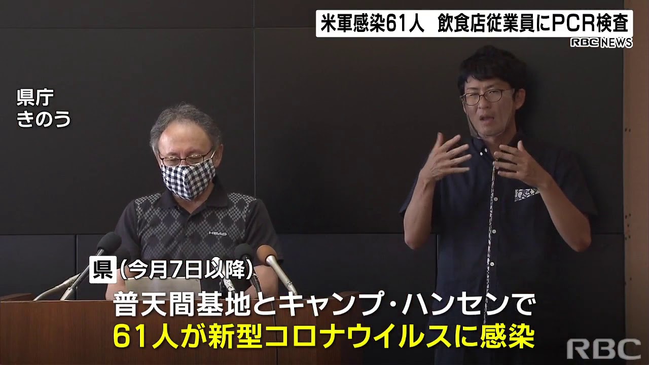 沖縄県は11日、県内の米軍関係者の新型コロナウイルス感染確認が7~11日にかけて計61人に上ったと、米側から報告を受けたと明らかにした。県は米軍関係者を県内の感染者数に計上しない。沖縄県は、在沖縄米軍トップの沖縄地域調整官が玉城デニー知事と電話会談し「普天間基地とキャンプ・ハンセンについてはロックダウンを行っている」と伝えたことを明らかにした。発表に先立ち、玉城氏は記者会見し「報告内容に衝撃を受けた。極めて遺憾。(米軍の)感染防止対策に強い疑念を抱かざるを得ない」と批判。米軍関係者が米の独立記念日に当たる4日前後に、夜の繁華街やビーチでのパーティーを楽しんでいた情報があるとして、参加者のうち、体調不良になった県民は医療機関などに相談することを呼び掛けた。(日本経済新聞)