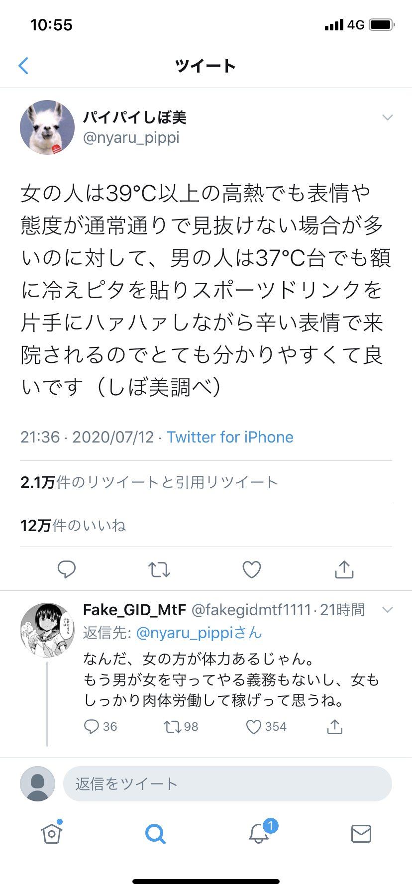 女の人は39℃以上の高熱でも表情や態度が通常通りで見抜けない場合が多いのに対して、男の人は37℃台でも額に冷えピタを貼りスポーツドリンクを片手にハァハァしながら辛い表情で来院されるのでとても分かりやすくて良いです(しぼ美調べ)