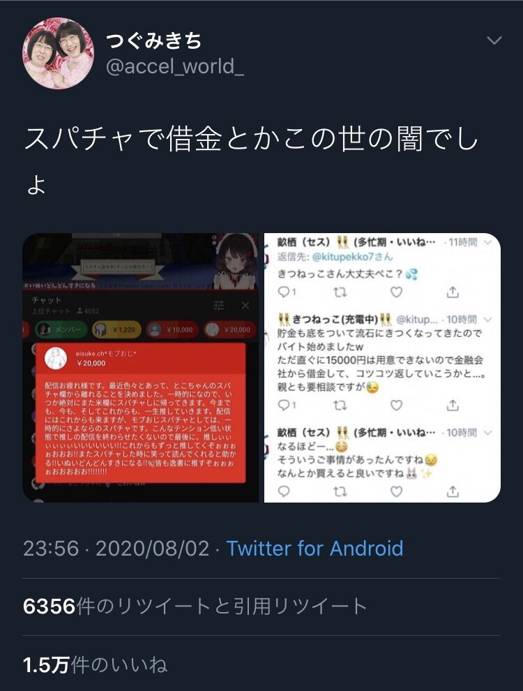 ホーム > ニュースetc > Twitter民「スパチャで借金とかこの世の闇でしょ」カオナシ「!?」シュバババ 2020/08/04 1: 風吹けば名無し 2020/08/04(火) 13:01:50.19 ID:7xp+cT7i0.net 続きを読む Source: 妹はVIPPER - ニュースetc