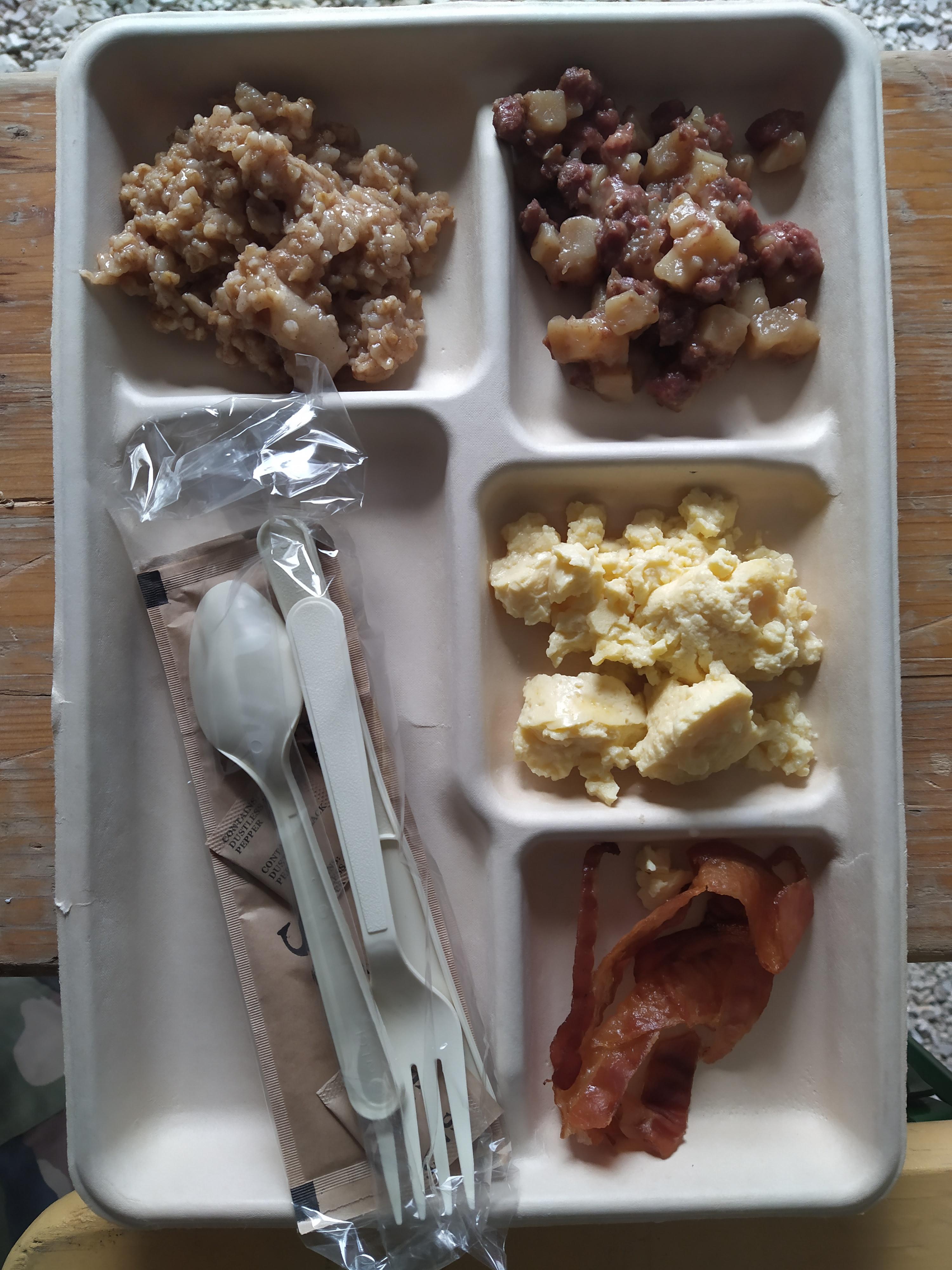りんご入りのオートミール、牛肉とジャガイモの何か、粉末の卵(塊状になってる)、ベーコン