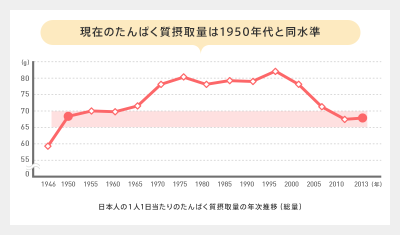 今や1950年代と同じくらいまで落ち込み、摂取するべきたんぱく質の量が摂れていない人も増えているのです。1日あたりのタンパク質平均摂取量