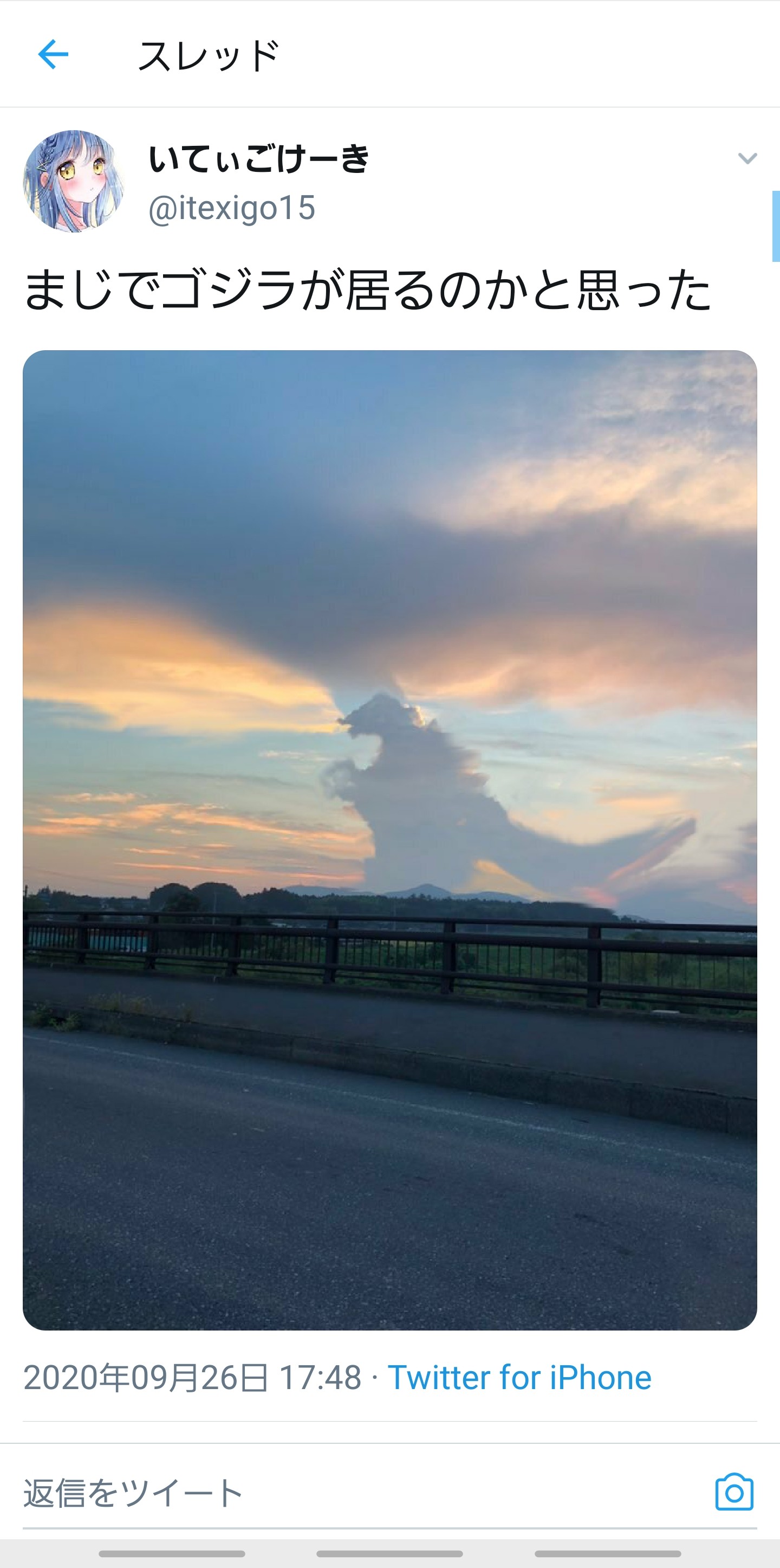 ホーム > ニュースetc > Twitter「ちょwwwwマジでゴジラ居たwwwwwwwwwww」 (※画像あり) 2020/09/29 1:風吹けば名無し:2020/09/27(日) 07:42:23.83 ID:WV7Jlpnf0.net 2:風吹けば名無し:2020/09/27(日) 07:42:40.50 ID:WSdQeVJx0.net すごい 5:風吹けば名無し:2020/09/27(日) 07:42:59.88 ID:1nx/jI4X0.net ええやん 続きを読む Source: ラビット速報 - ニュースetc